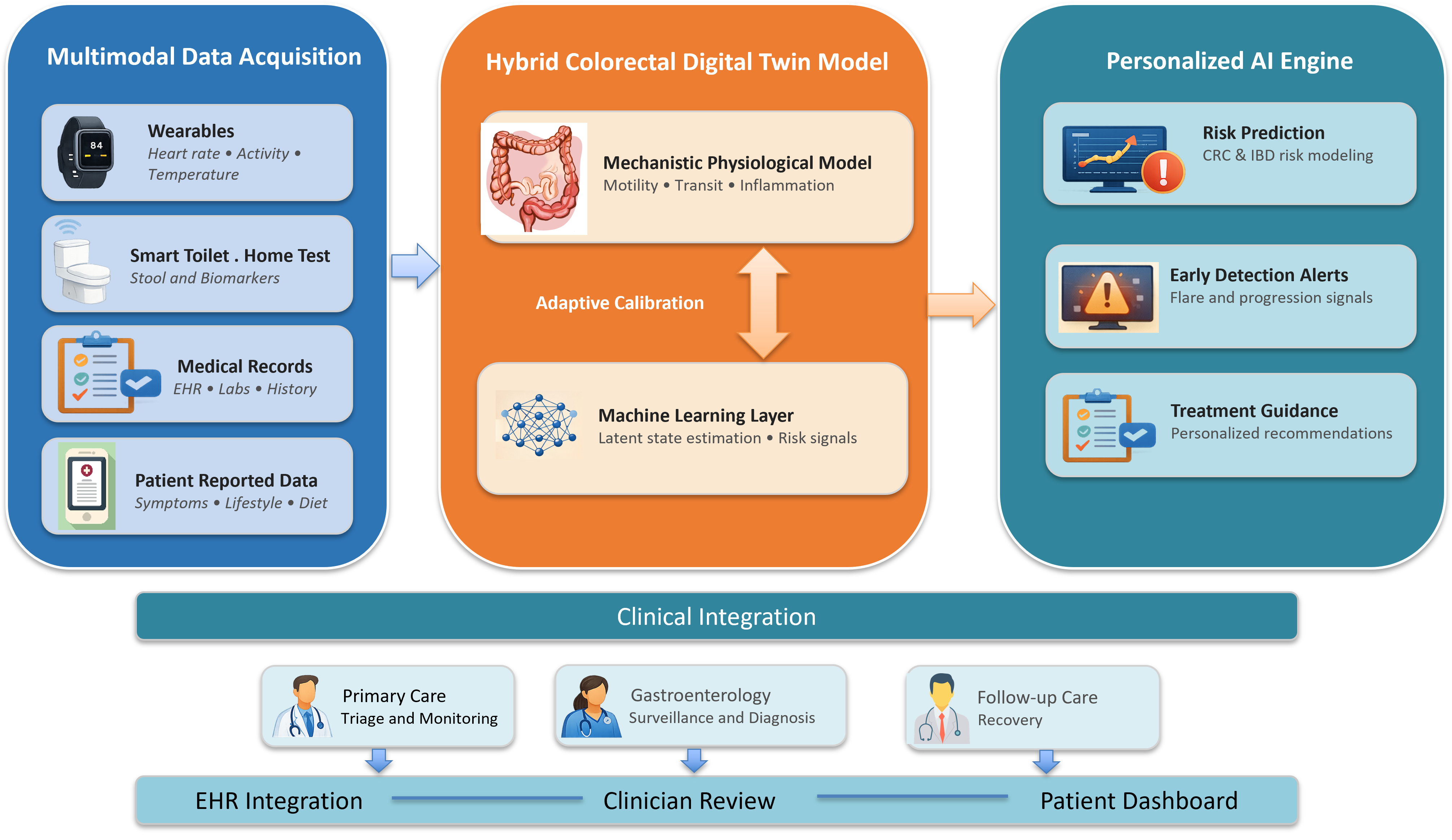 This research aims to develop a colorectal digital twin that integrates multimodal physiological and behavioral data streams, hybrid mechanistic–machine learning modeling of colorectal function, and a personalized artificial intelligence engine to support proactive disease detection and management.